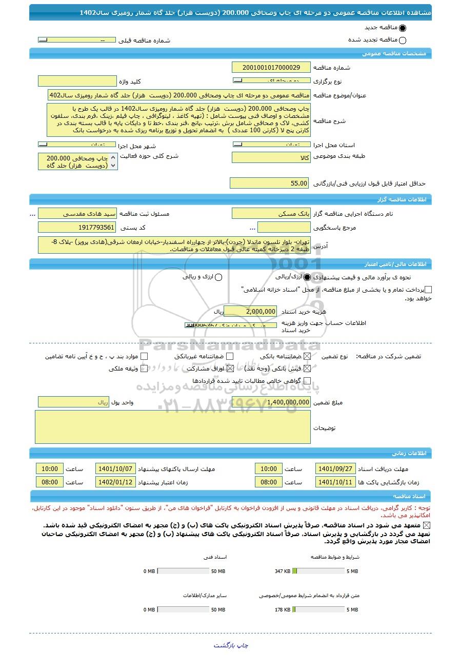 عنوان/موضوع مناقصه | مناقصه عمومی دو مرحله ای چاپ وصحافی 200.000 (دویست هزار) جلد گاه شمار رومیزی سال1402 | ||