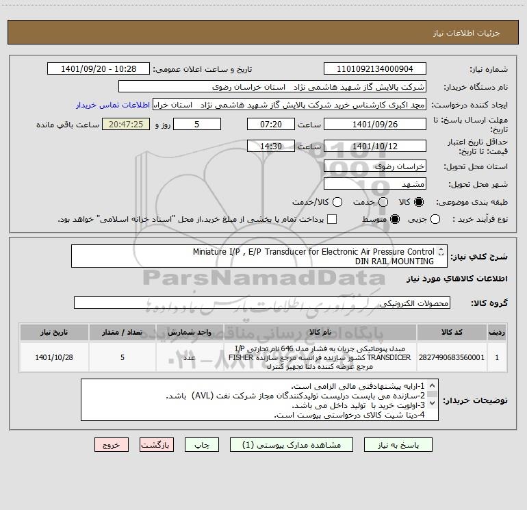 نام دستگاه خریدار:شرکت پالایش گاز شهید هاشمی نژاد استان خراسان رضوی