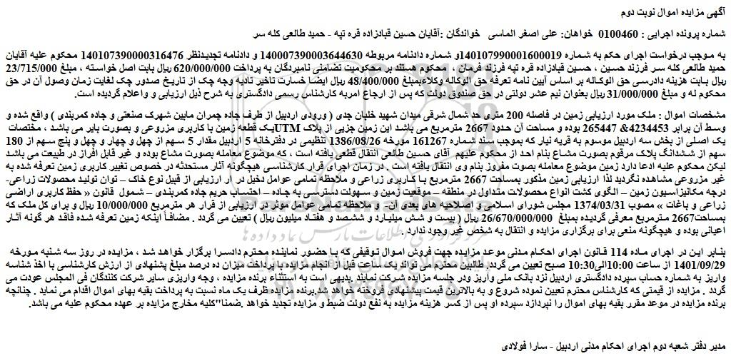 شماره پرونده اجرایی : 0100460 خواهان: علی اصغر الماسی خواندگان :آقایان حسین قبادزاده قره تپه - حمید طالعی کله سر