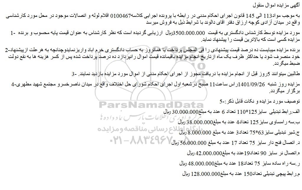 به موجب مواد113 الی 145 قانون اجرای احکام مدنی در رابطه با پرونده اجرایی کلاسه0100467 اقلام لوله و اتصالات موجود در محل مورد کارشناسی واقع در میدان آزادی کوچه ارزاق دفتر اقای دالوند با شرایط ذیل به فروش میرسد