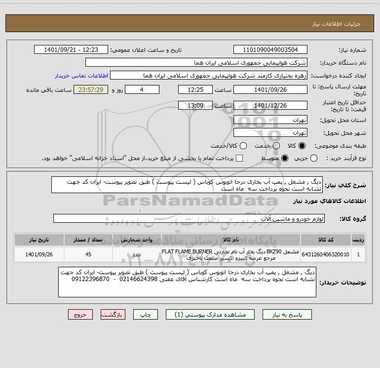 توضیحات خریدار:دیگ , مشعل , پمپ آب بخاری درجا اتوبوس کوباس ( لیست پیوست ) طبق تصویر پیوست- ایران کد جهت تشابه است نحوه پرداخت سه ماه است کارشناس آقای عفتی 02146624398 - 09122396870