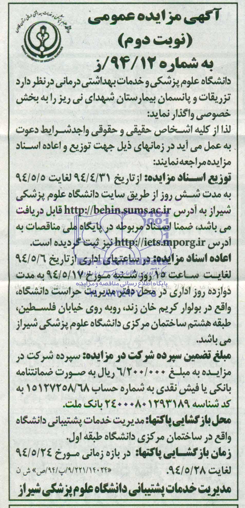 توزیع اسناد مزایده از تاریخ 94.4.31 لغایت 94.5.5 به مدت شش روز از طریق سایت دانشگاه علوم پزشکی شیراز به آدرس HTTP://BEHIN.SUMS.AC.IR قابل دریافت می باشد. ضمنا اسناد مربوطه در پایگاه ملی مناقصات به آدرس HTTP://IETS.MPORG.IR نیز ثبت گردیده است.
