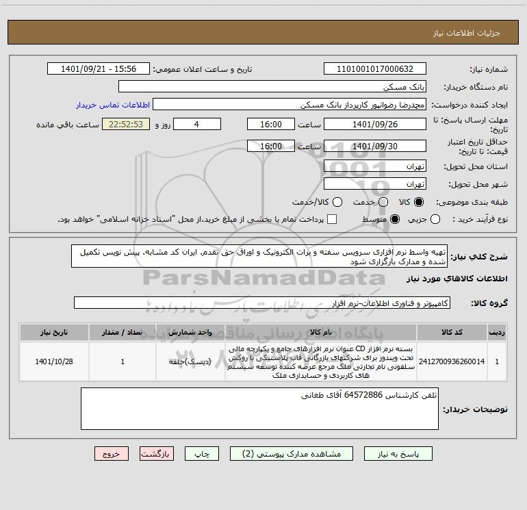 شرح کلی نیاز: تهیه واسط نرم افزاری سرویس سفته و برات الکترونیک و اوراق حق تقدم. ایران کد مشابه. پیش نویس تکمیل شده و مدارک بارگزاری شود
