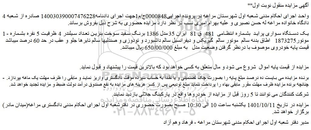 مزایده در تاریخ 1401/10/11 یکشنبه ساعت 10 الی 10:30 صبح بصورت حضوری در دفترشعبه اول اجرای احکام مدنی دادگستری مراغه(میدان مادر) برگزار خواهد شد.