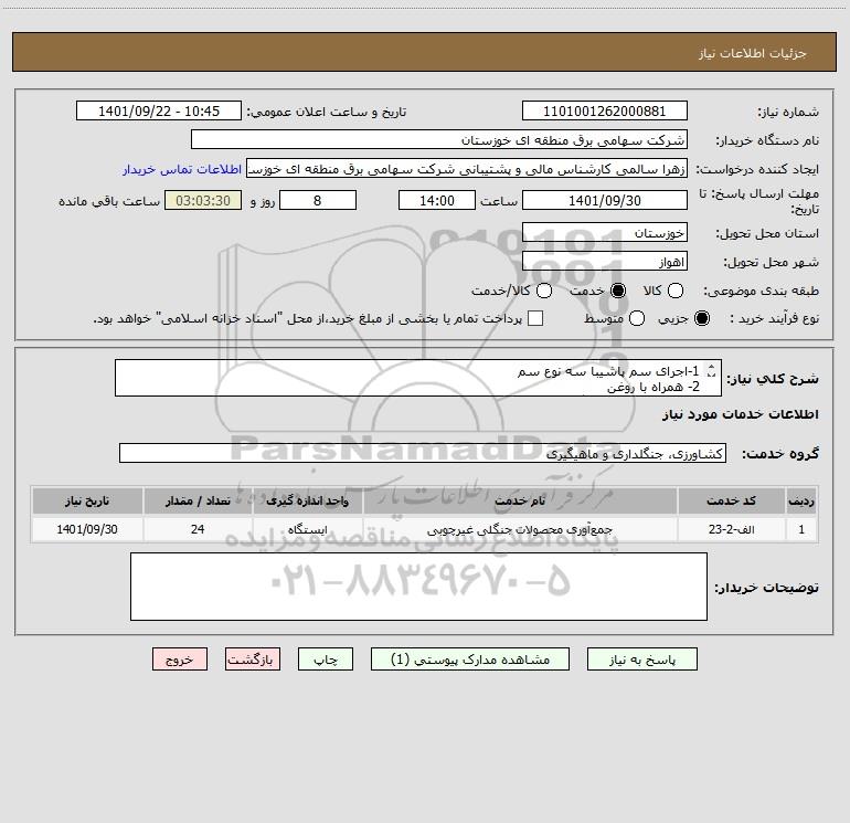 شرح کلی نیاز: 1-اجرای سم پاشیبا سه نوع سم 2- همراه با روغن 3- شرط داشتن دستگاه سم پاشی علاوه بر سم پاشی دستی 4- انجام کار زیر تجهیزات 5- داشتن نفر ایمنی