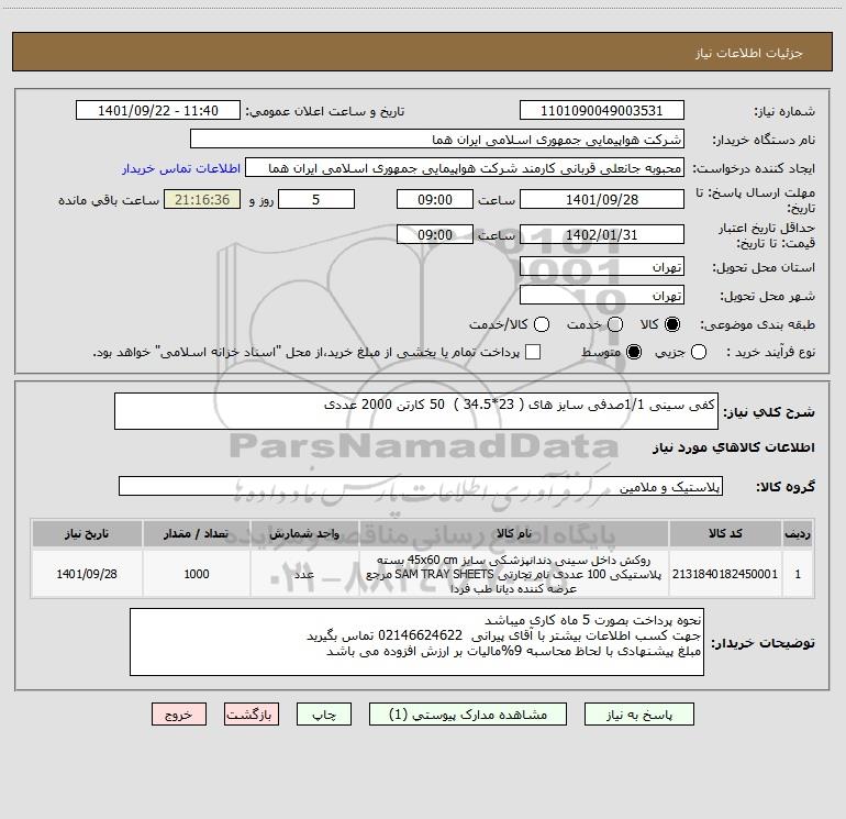 شرح کلی نیاز: کفی سینی 1/1صدفی سایز های ( 23*34.5 ) 50 کارتن 2000 عددی