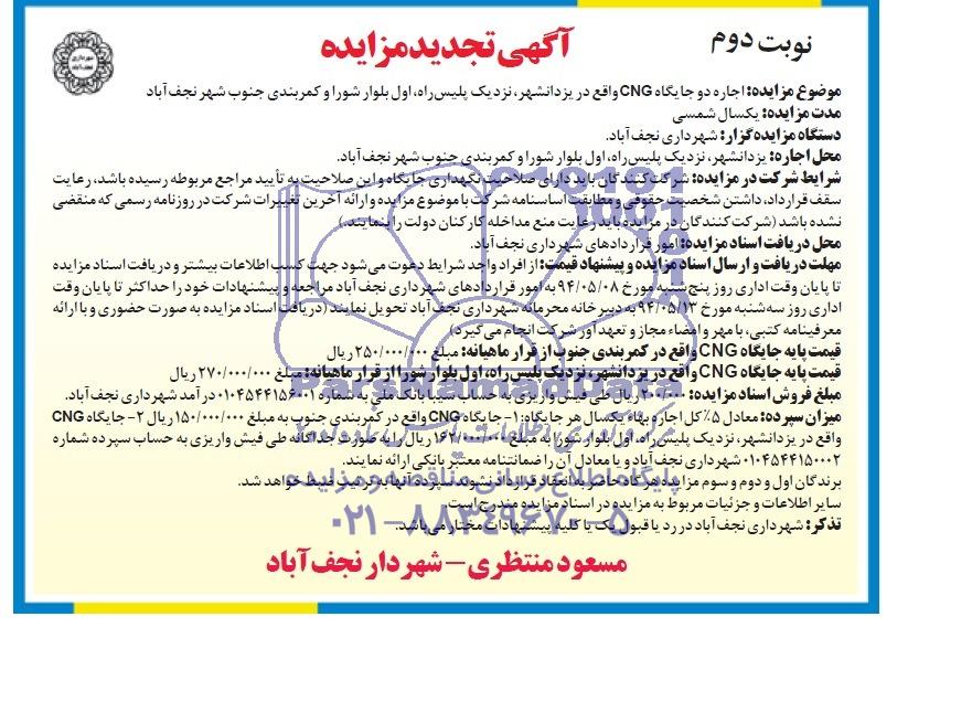 موضوع مزایده : اجاره دو جایگاه CNG واقع در یزدانشهر , نزدیک پلیس راه, اول بلوار شورا و کمربندی جنوب شهر نجف آباد