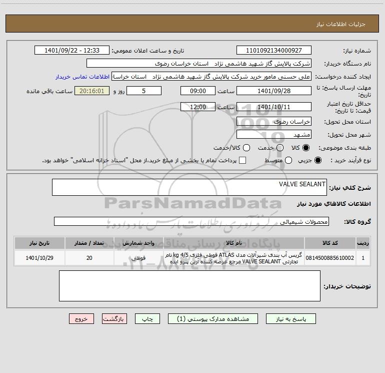 نام دستگاه خریدار:شرکت پالایش گاز شهید هاشمی نژاد استان خراسان رضوی