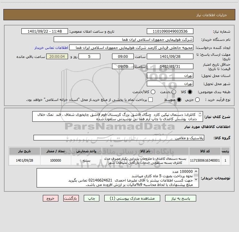 شرح کلی نیاز: کاتلری: دستمال نپکین کارد چنگال قاشق بزرگ کریستال فوم قاشق چایخوری شفاف ، قند نمک خلال دندان پوشش کاغذی با چاپ آرم هما نی نوشیدنی سلفون شده