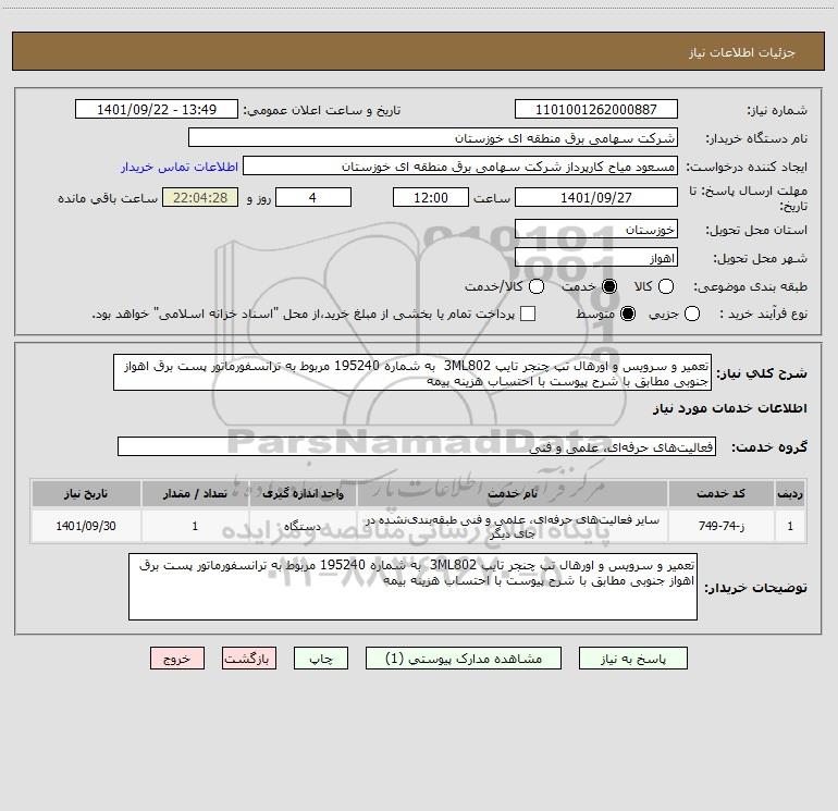 شرح کلی نیاز: تعمیر و سرویس و اورهال تپ چنجر تایپ 3ML802 به شماره 195240 مربوط به ترانسفورماتور پست برق اهواز جنوبی مطابق با شرح پیوست با احتساب هزینه بیمه