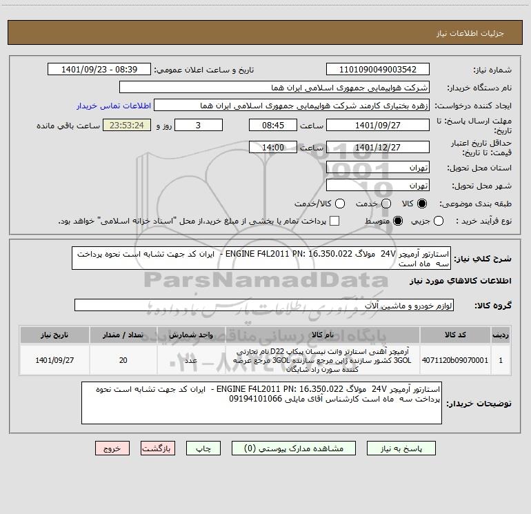 شرح کلی نیاز: استارتور آرمیچر 24V مولاگ ENGINE F4L2011 PN: 16.350.022 - ایران کد جهت تشابه است نحوه پرداخت سه ماه است