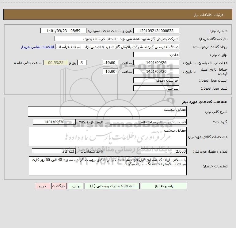نام دستگاه خریدار:شرکت پالایش گاز شهید هاشمی نژاد استان خراسان رضوی