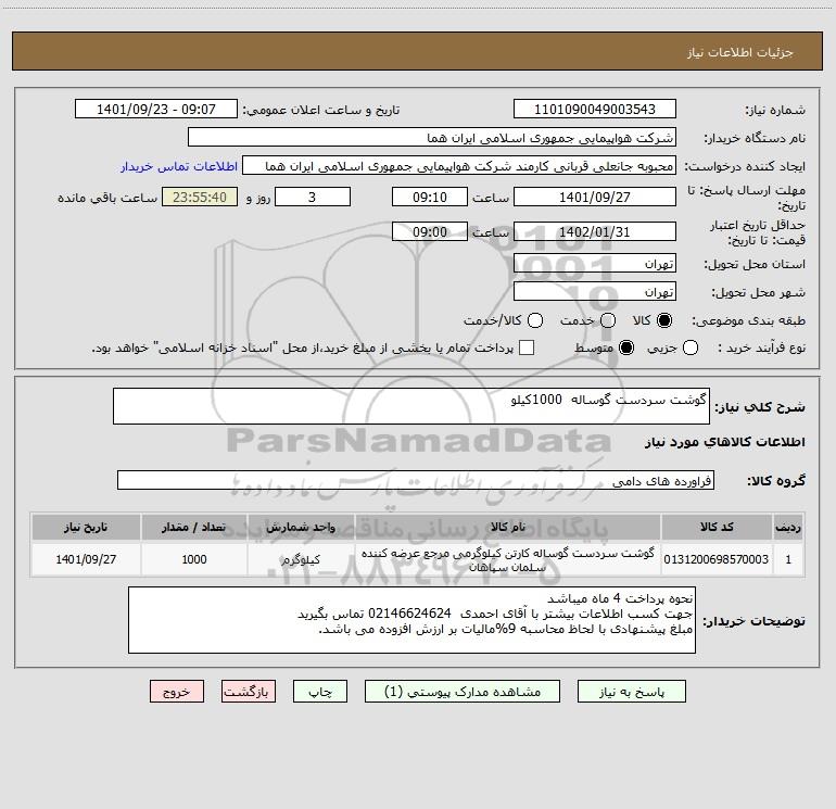 شرح کلی نیاز: گوشت سردست گوساله 1000کیلو