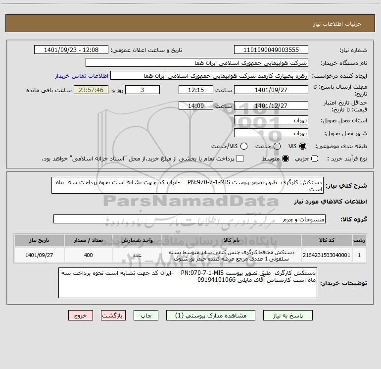 شرح کلی نیاز: دستکش کارگری طبق تصویر پیوست PN:970-7-1-MIS -ایران کد جهت تشابه است نحوه پرداخت سه ماه است