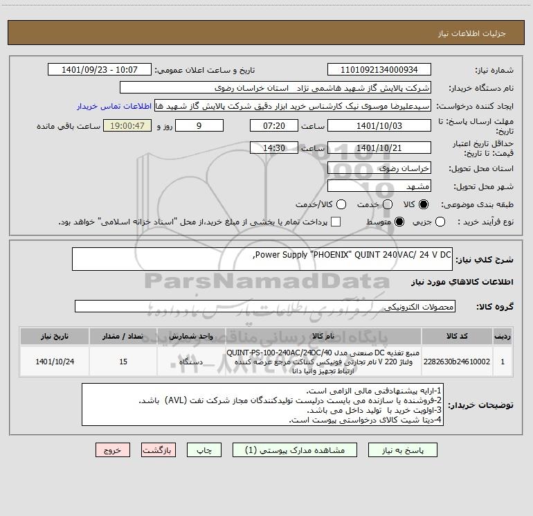 نام دستگاه خریدار:شرکت پالایش گاز شهید هاشمی نژاد استان خراسان رضوی