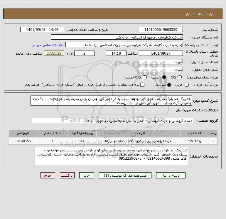 شرح کلی نیاز: تعمیریک عد بلوک سیلندر موتور فورد ودوعد سرسیلندر موتور فورد وتراش بوش سرسیلندر موتورفورد - سنگ زدن وتعویض گیت وسوپاپ موتور فوردطبق لیست پیوست