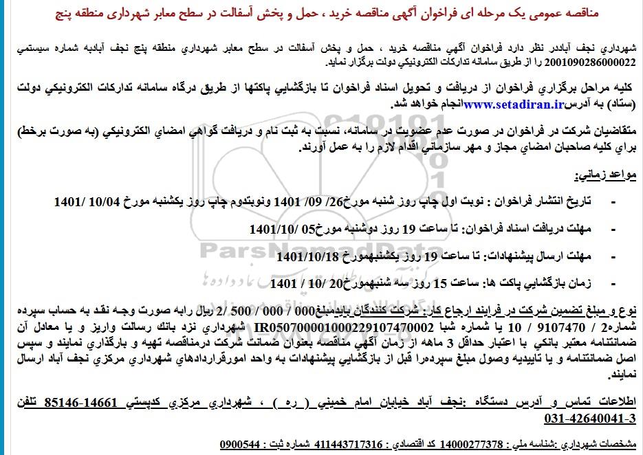 شهرداری نجف آباد در نظر دراد فراخوان آگهی مناقصه  خرید، حمل و پخش آسفالت در سطح معابر شهرداری منطقه پنج به شماره سیستمی 2001090286000022 را از طریق سامانه تدارکات الکترونیکی دولت برگزار نماید. کلیه مراحل برگزاری فراخوان از دریافت و تحویل اسناد فراخوان تا بازگشایی پاکت ها از طریق درگاه سامانه تدارکات اکلترونیکی دولت ستاد به آدرس ستاد ایران انجام خواهد شد متقاضیان شرکت در فراخوان در صورت عدم عضویت در سامانه نسبت به ثبت نام و دریافت گواهی امضای الکترونیکی به صورت برخط برای کلیه صاحبان امضای مجاز و مهر سازمانی اقدام لازم را به عمل آورند