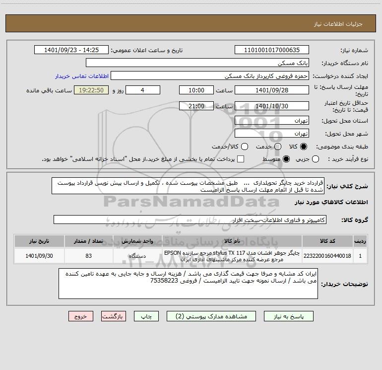 شرح کلی نیاز: قرارداد خرید چاپگر تحویلداری ... طبق مشخصات پیوست شده ، تکمیل و ارسال پیش نویس قرارداد پیوست شده تا قبل از اتمام مهلت ارسال پاسخ الزامیست