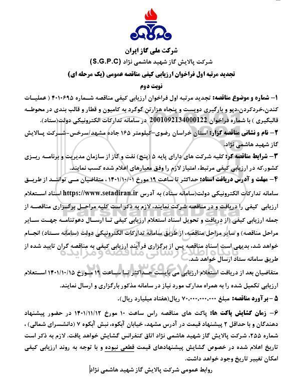 نام و نشانی مناقصه گزار: استان خراسان رضوی کیلومتر 165 جاده مشهد سرخس شرکت پالایش گاز شهید هاشمی نژاد