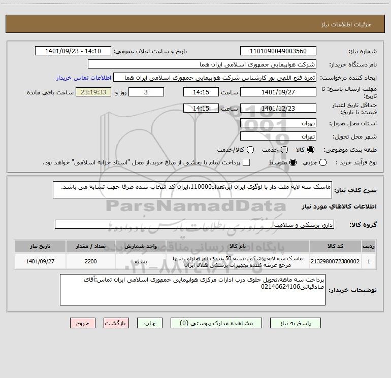 شرح کلی نیاز: ماسک سه لایه ملت دار با لوگوی ایران ایر،تعداد110000،ایران کد انتخاب شده صرفا جهت تشابه می باشد.