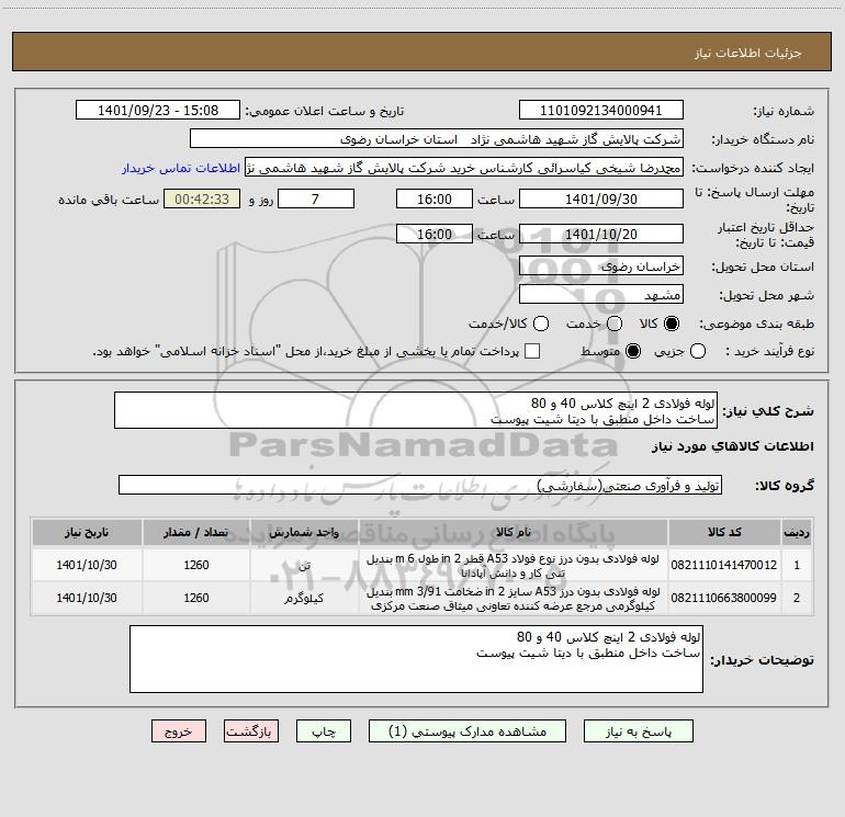 شرح کلی نیاز: لوله فولادی 2 اینچ کلاس 40 و 80