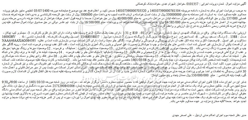 آگهی مزایده اموال  شماره پرونده اجرایی : 0101357 ،خواهان :شهرام عبدی ،خوانده:بابک کوهستانی