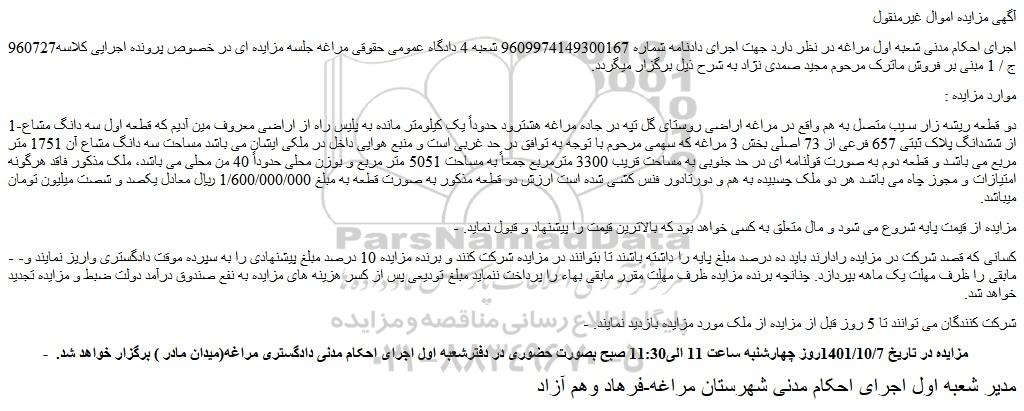 اجرای احکام مدنی شعبه اول مراغه در نظر دارد جهت اجرای دادنامه شماره 9609974149300167 شعبه 4 دادگاه عمومی حقوقی مراغه جلسه مزایده ای در خصوص پرونده اجرایی کلاسه960727 ج / 1 مبنی بر فروش ماترک مرحوم مجید صمدی نژاد به شرح ذیل برگزار میگردد.