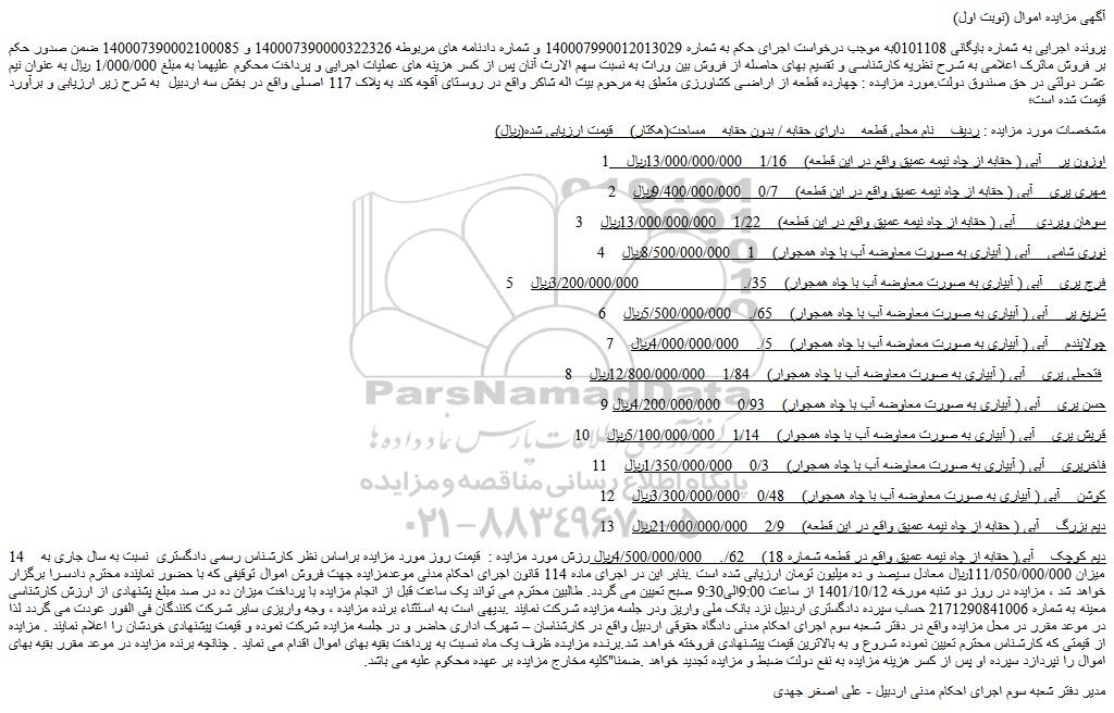 پرونده اجرایی به شماره بایگانی 0101108به موجب درخواست اجرای حکم به شماره 140007990012013029 و شماره دادنامه های مربوطه 140007390000322326 و 140007390002100085 ضمن صدور حکم بر فروش ماترک اعلامی به شرح نظریه کارشناسی و تقسیم بهای حاصله از فروش بین وراث به نسبت سهم الارث آنان پس از کسر هزینه های عملیات اجرایی و پرداخت محکوم علیهما به مبلغ 1/000/000 ریال به عنوان نیم عشر دولتی در حق صندوق دولت.مورد مزایده : چهارده قطعه از اراضی کشاورزی متعلق به مرحوم بیت اله شاکر واقع در روستای آقچه کند به پلاک 117 اصلی واقع در بخش سه اردبیل به شرح زیر ارزیابی و برآورد قیمت شده است؛