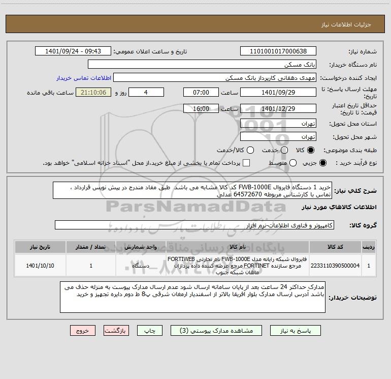 شرح کلی نیاز: خرید 1 دستگاه فایروال FWB-1000E کد کالا مشابه می باشد طبق مفاد مندرج در پیش نویس قرارداد ، تماس با کارشناس مربوطه 64572670 عدلی