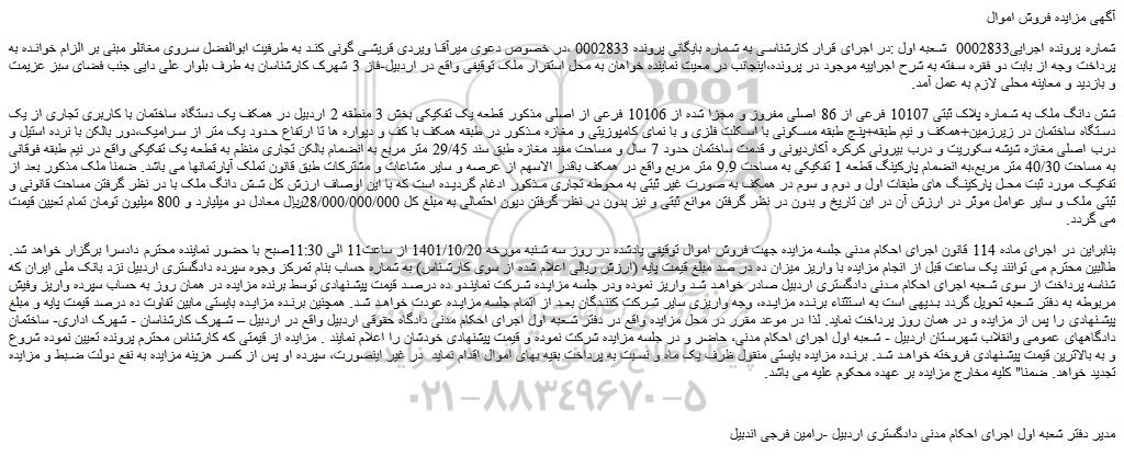 بنابراین در اجرای ماده 114 قانون اجرای احکام مدنی جلسه مزایده جهت فروش اموال توقیفی یادشده در روز سه شنبه مورخه 1401/10/20 از ساعت11 الی 11:30صبح با حضور نماینده محترم دادسرا برگزار خواهد شد. طالبین محترم می توانند یک ساعت قبل از انجام مزایده با واریز میزان ده در صد مبلغ قیمت پایه (ارزش ریالی اعلام شده از سوی کارشناس) به شماره حساب بنام تمرکز وجوه سپرده دادگستری اردبیل نزد بانک ملی ایران که شناسه پرداخت از سوی شعبه اجرای احکام مدنی دادگستری اردبیل صادر خواهد شد واریز نموده ودر جلسه مزایده شرکت نمایندو ده درصد قیمت پیشنهادی توسط برنده مزایده در همان روز به حساب سپرده واریز وفیش مربوطه به دفتر شعبه تحویل گردد بدیهی است به استثناء برنده مزایده، وجه واریزی سایر شرکت کنندگان بعد از اتمام جلسه مزایده عودت خواهد شد. همچنین برنده مزایده بایستی مابین تفاوت ده درصد قیمت پایه و مبلغ پیشنهادی را پس از مزایده و در همان روز پرداخت نماید. لذا در موعد مقرر در محل مزایده واقع در دفتر شعبه اول اجرای احکام مدنی دادگاه حقوقی اردبیل واقع در اردبیل – شهرک کارشناسان - شهرک اداری- ساختمان دادگاههای عمومی وانقلاب شهرستان اردبیل - شعبه اول اجرای احکام مدنی، حاضر و در جلسه مزایده شرکت نموده و قیمت پیشنهادی خودشان را اعلام نمایند . مزایده از قیمتی که کارشناس محترم پرونده تعیین نموده شروع و به بالاترین قیمت پیشنهادی فروخته خواهد شد. برنده مزایده بایستی منقول ظرف یک ماه و نسبت به پرداخت بقیه بهای اموال اقدام نماید در غیر اینصورت، سپرده او پس از کسر هزینه مزایده به نفع دولت ضبط و مزایده تجدید خواهد. ضمنا" کلیه مخارج مزایده بر عهده محکوم علیه می باشد.