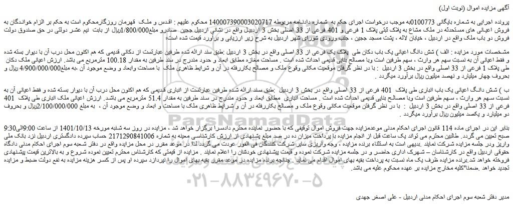 پرونده اجرایی به شماره بایگانی 0100773به موجب درخواست اجرای حکم به شماره دادنامه مربوطه 140007390003020717 محکوم علیهم : اقدس و ملک قهرمان روزگارمحکوم است به حکم بر الزام خواندگان به فروش اعیانی های مستحدثه در ملک مشاع به پلاک ثبتی پلاک 1 فرعی و 401 فرعی از 33 اصلی بخش 3 اردبیل واقع در نشانی اردبیل ججین صادرو مبلغ1/800/000ریال از بابت نیم عشر دولتی در حق صندوق دولت فروش دو باب ملک واقع در اردبیل ، خیابان لاله ، پشت مسجد ججین ، جنب ورودی شورای شهر اردبیل به شرح زیر ارزیابی و برآورد قیمت شده است؛