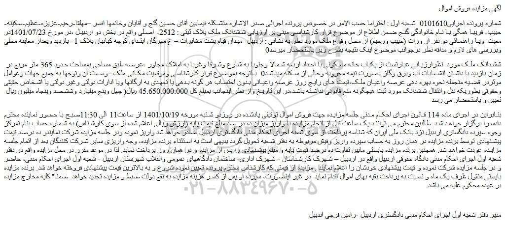 شماره پرونده اجرایی0101610  شعبه اول : احتراما حسب الامر در خصوص پرونده اجرائی صدر الاشاره متشکله فیمابین آقای حسین گنج و آقایان وخانمها افسر –مهلقا-رحیم-عزیزه-عظیم-سکینه-حبیب- فریبا همگی با نام خانوادگی گنج ضمن اطلاع از موضوع قرار کارشناسی مبنی بر ارزیابی ششدانک ملک پلاک ثبتی : 2512- اصلی واقع در بخش دو اردبیل ،در مورخ 1401/07/23در معیت  وبا راهنمائی دو نفر از وراث (حبیب ورحیم) از محل وقوع ملک مورد نظر به نشانی : اردبیل- میدان قیام پشت مخابرات – خ مهرگان ابتدای کوچه کیانیان پلاک 1- بازدید وبعداز معاینه محلی وبررسی های لازم و مداقه نظر درجوانب موضوع اینک نتیجه بشرح زیر باستحضار میرسد0