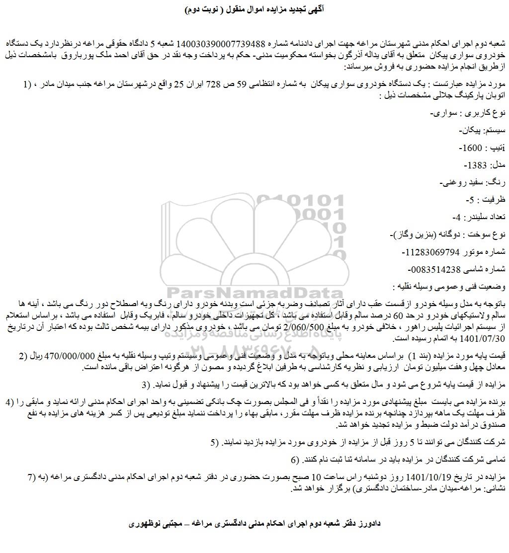 1) مورد مزایده عبارتست : یک دستگاه خودروی سواری پیکان به شماره انتظامی 59 ص 728 ایران 25 واقع درشهرستان مراغه جنب میدان مادر ، اتوبان پارکینگ جلالی مشخصات ذیل :