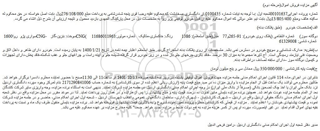 شماره پرونده اجرایی00101637شعبه اول :با توجه به نیابت شماره 0100435 از دادگستری صفادشت که محکوم علیه رضا قوی پنجه شندرشامی به پرداخت مبلغ 276/108/000ریال بابت اصل خواسته در حق محکوم له سکینه هاتف ومبلغ 13/805/400ریال بابت نیم عشر دولتی که اموال محکوم علیه از قبیل خودرو توقیفی پژو روآ به مشخصات ذیل در محل پارکینگ المهدی بازدید معمول و نتیجه ارزیابی آن بشرح ذیل انشاء می گردد.