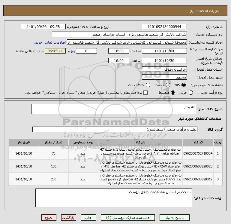 | 1 | 0962300752710004 | تله بخار ترموستاتیکی جنس فولاد کربنی سایز 1 in فشار 47 bar نام تجارتی S.A.V مرجع عرضه کننده صنایع پتروشیمی آذربایجان | عدد | 70 | 1401/10/30 |