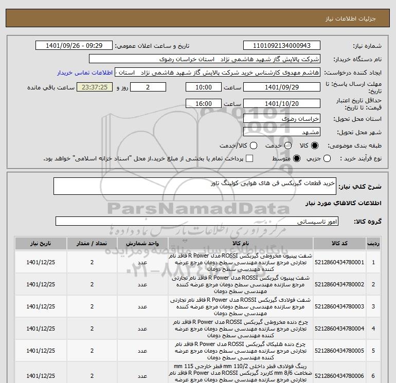 نام دستگاه خریدار:شرکت پالایش گاز شهید هاشمی نژاد استان خراسان رضوی