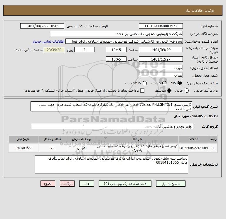 شرح کلی نیاز: گریس نسوز PN:LGMT3/1 تعداد72 قوطی هر قوطی یک کیلوگرم ،ایران کد انتخاب شده صرفا جهت تشابه می باشد.