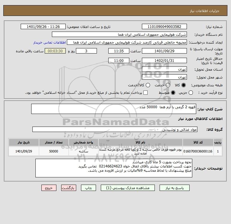 شرح کلی نیاز: قهوه 2 گرمی با آرم هما 50000 عدد