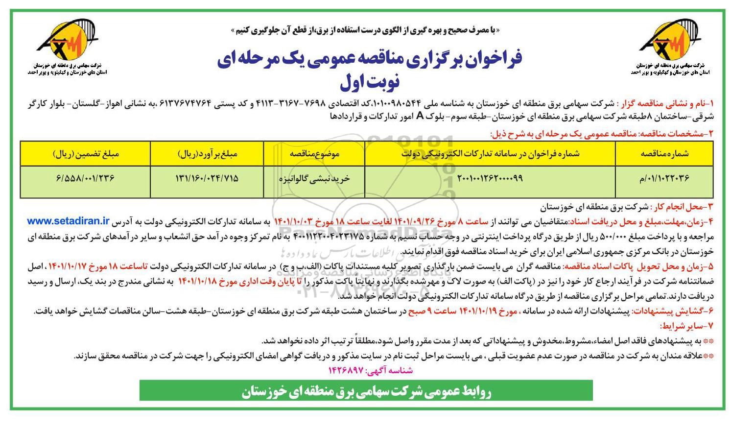 1. نام و نشانی مناقصه گزار: شرکت سهامی برق منطقه ای خوزستان به شناسه ملی 10100980544 کد اقتصادی 7698-3167-4113 و کدپستی 6137674764 به نشانی اهواز، گلستان بلوار کارگر شرقی، ساختمان 8 طبقه شرکت سهامی برق منطقه ای خوزستان، طبقه سوم، بلوک A امور تدارکات و قراردادها
