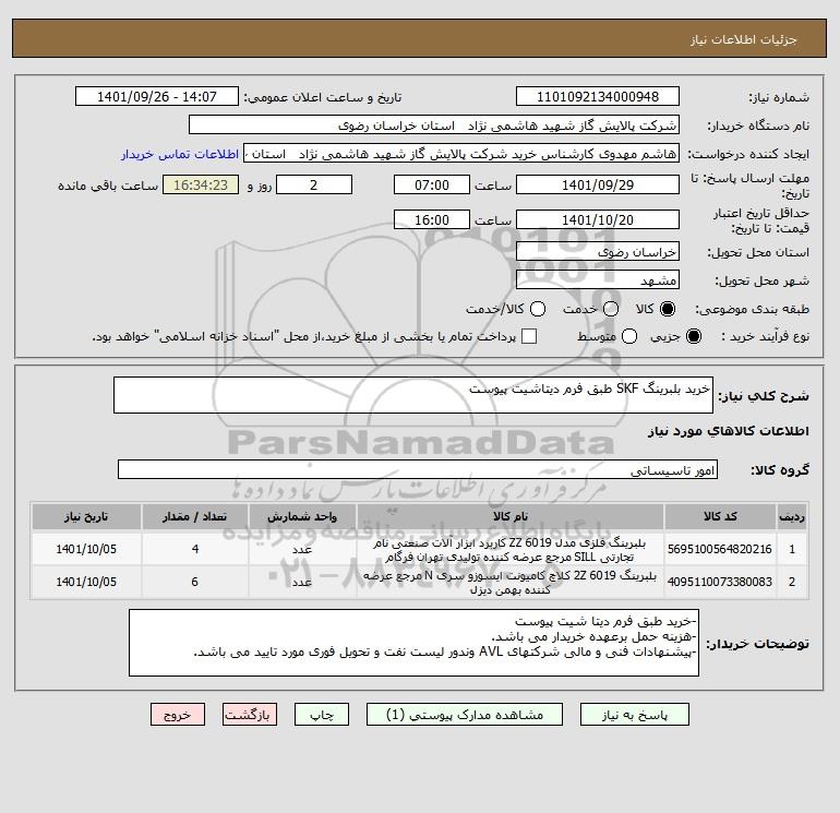 شرح کلی نیاز: خرید بلبرینگ SKF طبق فرم دیتاشیت پیوست