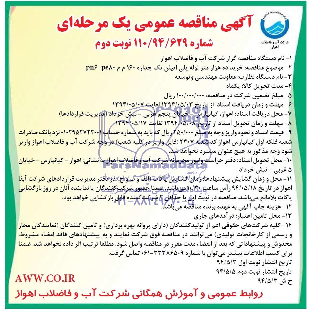 مناقصه عمومی یک مرحله ای خرید ده هزار متر لوله پلی اتیلن تک جداره 160 م م از کلیه افراد متخصص و شرکتها واجد شرایط دعوت به عمل میآید در مناقصه با کد خبرگزاری پارس نماد: 528466 شرکت نمایند.