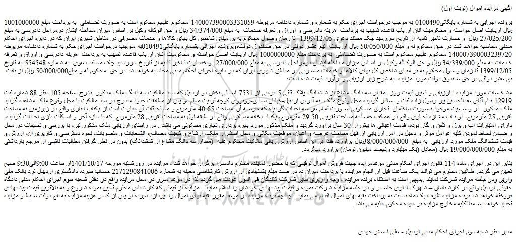 بنابر این در اجرای ماده 114 قانون اجرای احکام مدنی موعدمزایده جهت فروش اموال توقیفی که با حضور نماینده محترم دادسرا برگزار خواهد شد ، مزایده در روزشنبه مورخه 1401/10/17از ساعت 9:00الی9:30 صبح تعیین می گردد. طالبین محترم می تواند یک ساعت قبل از انجام مزایده با پرداخت میزان ده در صد مبلغ پشنهادی از ارزش کارشناسی معینه به شماره 2171290841006 حساب سپرده دادگستری اردبیل نزد بانک ملی واریز ودر جلسه مزایده شرکت نمایند .بدیهی است به استثناء برنده مزایده ، وجه واریزی سایر شرکت کنندگان فی الفور عودت می گردد لذا در موعد مقرر در محل مزایده واقع در دفتر شعبه سوم اجرای احکام مدنی دادگاه حقوقی اردبیل واقع در کارشناسان – شهرک اداری حاضر و در جلسه مزایده شرکت نموده و قیمت پیشنهادی خودشان را اعلام نمایند . مزایده از قیمتی که کارشناس محترم تعیین نموده شروع و به بالاترین قیمت پیشنهادی فروخته خواهد شد.برنده مزایده ظرف یک ماه نسبت به پرداخت بقیه بهای اموال اقدام می نماید . چنانچه برنده مزایده در موعد مقرر بقیه بهای اموال را نپردازد سپرده او پس از کسر هزینه مزایده به نفع دولت ضبط و مزایده تجدید خواهد .ضمنا"کلیه مخارج مزایده بر عهده محکوم علیه می باشد.