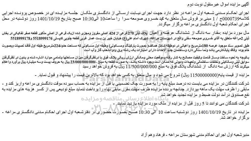 اجرای احکام مدنی شعبه اول مراغه در نظر دارد جهت اجرای نیابت ارسالی از دادگستری ملکان  جلسه مزایده ای در خصوص پرونده اجرایی کلاسه0000739ج / 1 مبنی بر فروش مال متعلق به محمد خسروی صومعه سرا  را ساعت10 الی10:30 صبح بتاریخ 1401/10/19 روز دوشنبه در محل اجرای احکام شعبه اول دادگستری مراغه برگزار میگردد.