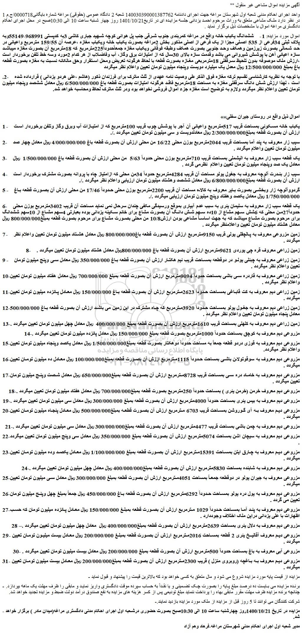 "آگهی مزایده اموال مشاعی غیر منقول "