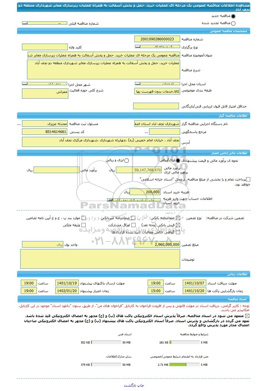 مناقصه، مناقصه عمومی یک مرحله ای عملیات خرید، حمل و پخش آسفالت به همراه عملیات زیرسازی معابر شهرداری منطقه دو نجف آباد از کلیه افراد متخصص و شرکت‌ها واجد شرایط دعوت به عمل می‌آید در مناقصه با کد خبرگزاری پارس نماد: 5285876 شرکت نمایند. این مناقصه در تاریخ 1401/09/27 شروع و مهلت آن تا تاریخ 1401/10/07 میباشد.
