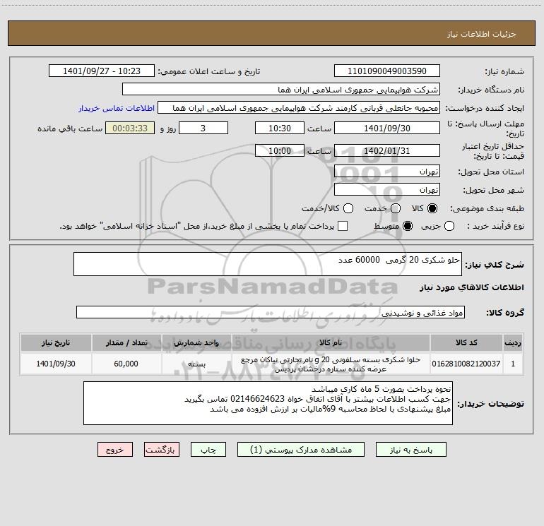 شرح کلی نیاز: حلو شکری 20 گرمی 60000 عدد