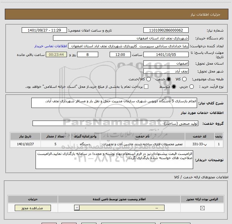 شرح کلی نیاز: اتجام بازسازی 5 دستگاه اتوبوس شهری سازمان مدیریت حمل و نقل بار و مسافر شهرداری نجف آباد.