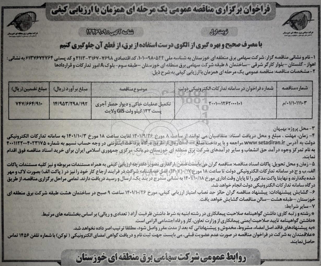 | 1011103/01/م | 2001001262000101 | تکمیل عملیات خاکی و دیوار حصار آجری پست 132 کیلوولت gis ولایت | 14.953.298.192 | 747.664.910 |