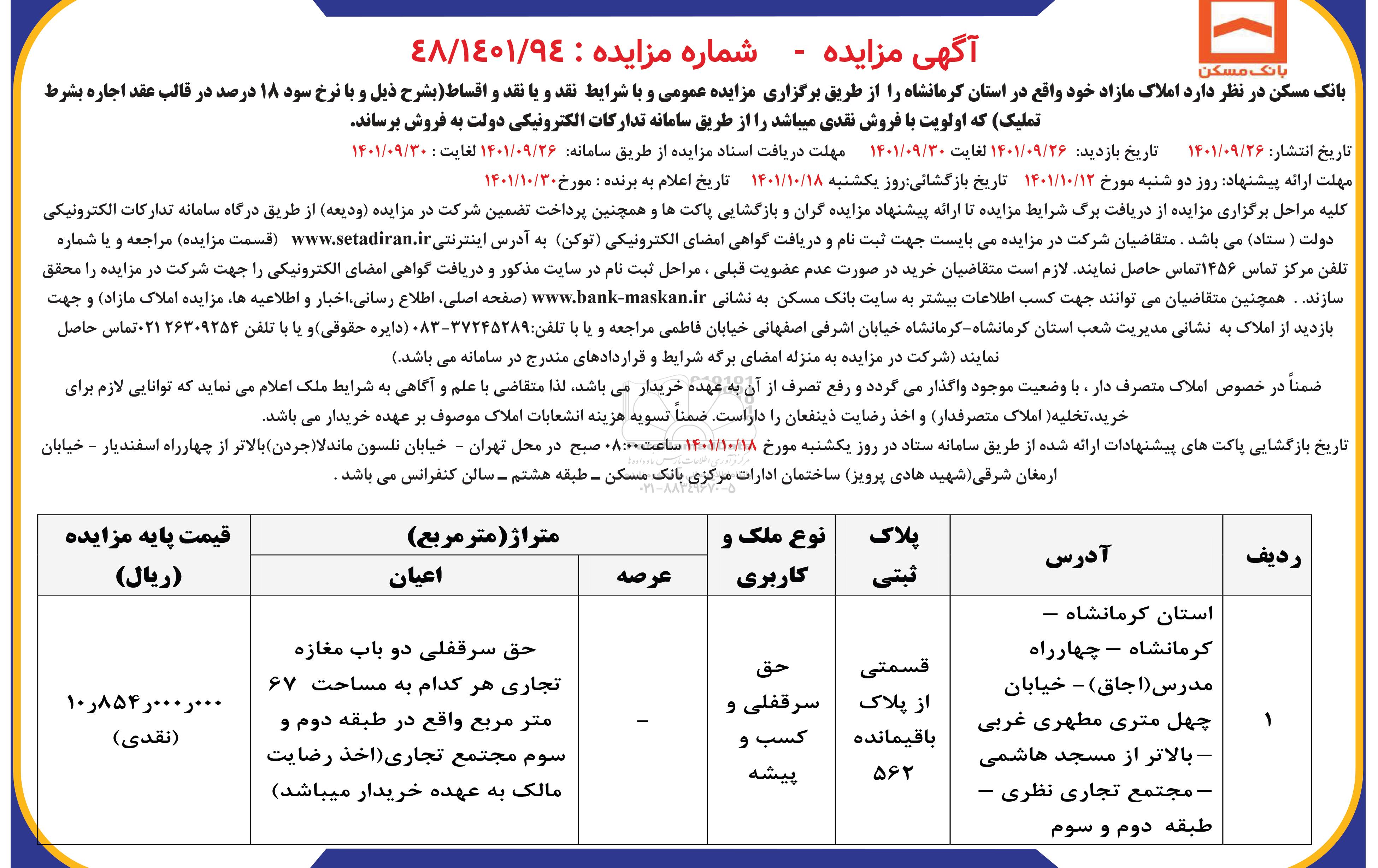 مزایده فروش املاک مازاد با کاربری حق سرقفلی و کسب و پیشه واقع در استان کرمانشاه