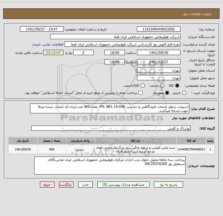 شرح کلی نیاز: اسپیلت شلوار خدمات فرودگاهی و حراست PN: 881-15-04B ،تعداد900 عدد،ایران کد انتخاب شده صرفا جهت تشابه میباشد.
